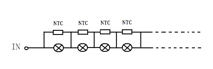 一串串聯的低壓白熾燈可以這樣連接,即,電路中的每個燈珠并聯一個常溫R25:400-2200歐姆的溫度敏感的NTC熱敏電阻。當一串燈正常工作時,熱敏電阻阻值比燈泡的阻值要大的多。可是,當燈泡損壞開路時,電壓全部加到熱敏電阻上面,這個電流使NTC的溫度升高,阻值變小,NTC幾乎處于完全導通的狀態。幾乎相同的電流和電壓通過燈串中的剩余的燈泡,即使由于這個燈串中的其他燈泡燒壞、插座松動或者從各自基座脫落導致不能工作了,其他燈珠依然可以發亮,而且是正常亮度。因此相較于沒有并聯燈串來講僅僅增加了5%的電流。這樣,就不會因為其中一個燈泡壞掉而使其他燈過亮,而導致其他燈泡的壽命縮短。