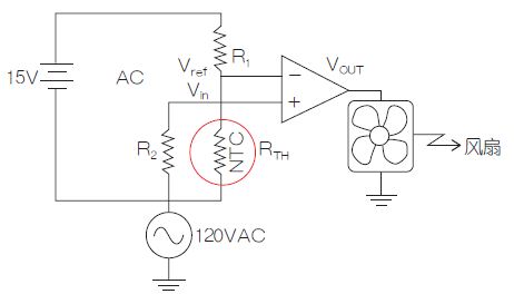 負溫度系數(NTC)熱敏電阻能夠非常有效地檢測出環境溫度的上升。因為是負溫度系數,當環境溫度上升時,熱敏電阻的阻值將降低。本例中的測溫電橋在控制風扇工作的過程中,利用的就是熱敏電阻的這一獨特特征。